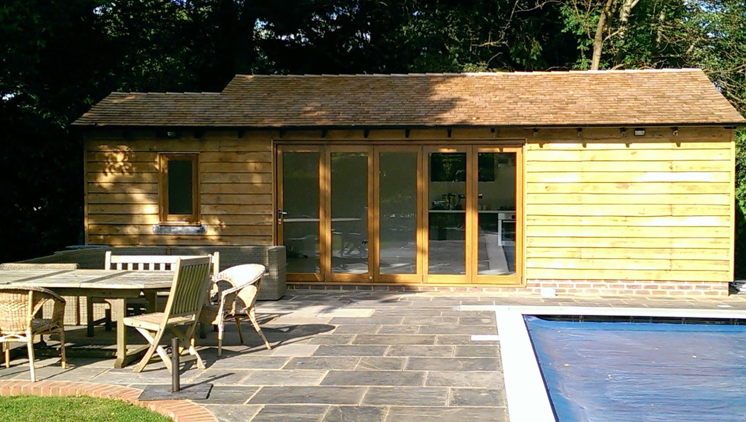 This was constructed to replace a tired small pool house with the addition of a kitchen area and shower room. The complex part of the project was to construct a new larger one in its place whilst not having to move any of the existing pool mechanics. The new pool house was constructed using a timber frame on a brick plinth covered with a cedar shingle roof, this was then clad in fresh sawn featheredge oak cladding. The Oak windows where handmade in own workshop. To complete the project we also enlarged the paving area around the pool to create a barbecue and seating area.