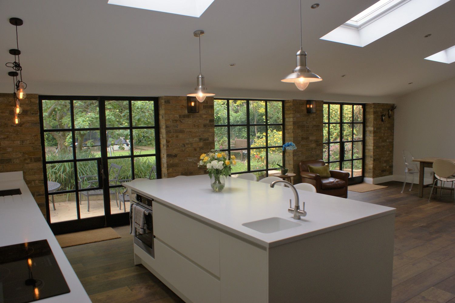 A spacious single storey kitchen extension was created across the rear of the property to replace an old conservatory. The client had some fantastic ideas that ideally she wanted to incorporate into the overall finished design, such as the exposed brickwork pillars between the doors and the traditional but modern version of Critall glazed doors. We successfully managed to achieve the required results, we also constructed a bespoke solid oak slab table, which was made using two tree slabs and joined together.